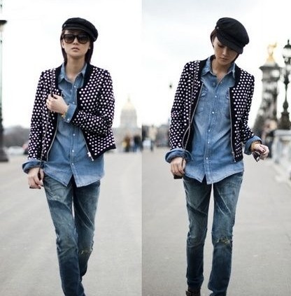 比起董璇林鹏则是把鸭舌帽的硬朗发挥的很到位,只搭配牛仔装难免会感觉平庸,配上圆领开衫既修饰脸型也能起到提升气质的作用。