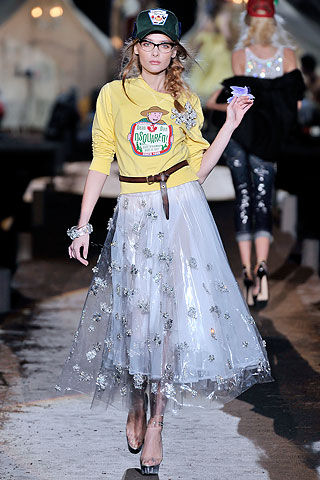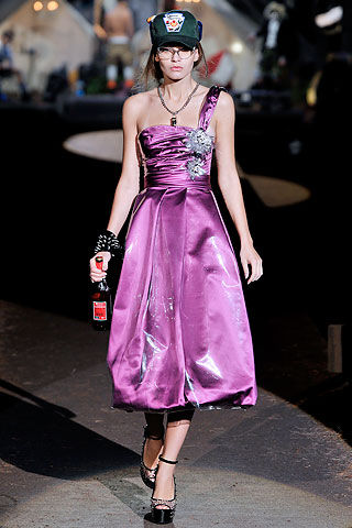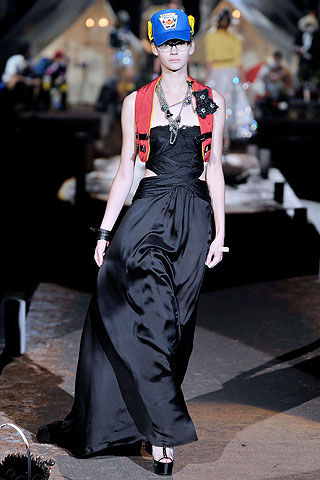 看了上面这些有趣的混搭,来看看比较有颠覆性的搭配吧!模特拎着酒瓶,微醉的走在T台上,闪闪发亮的礼服不仅让人羡慕起欢乐的派对来。只不过,棒球帽+礼服的新奇组合,也只能非正式的场合来用吧!