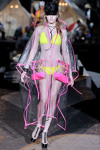 呃,看着模特们穿的那么清凉的比基尼泳装,再看看头顶的帽子和脚下的长靴,真不知道是冷还是热了。不过设计师们要表达的只是快乐的露营气氛,为什么不能这么穿呢?